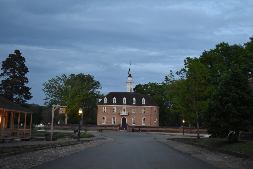 The re-created Capitol building is at the end of the Duke of Gloucester Street. The College of William and Mary is at the other end.