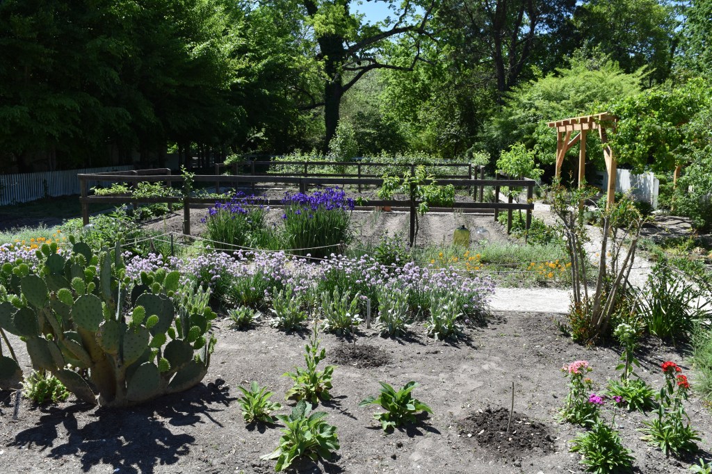 Hardy cactus (Opuntia) growing with Chives. Make sure you check out the Colonial vegetable garden near the windmill.