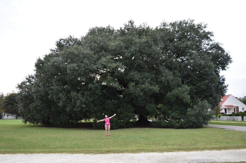 Jenny Rose Carey with her favorite tree at Colonial Williamsburg. It is a Compton Oak.